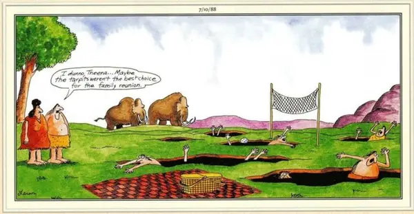 De man in de grot betreurde het dat hij en zijn vrouw een plaats hadden gekozen voor familiestoelen. En als je denkt dat het spijt heeft , A his whole family sinking into the tar pits, clawing at the ground to stay above the surface. The family was expecting a fun day of catching up and playing volleyball, As seen by the net in the comic strip, but what they got was far different.