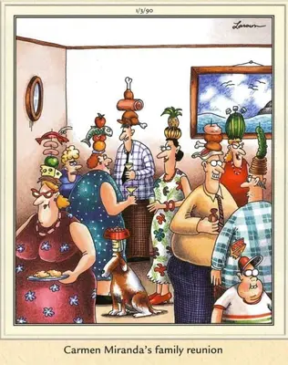 Het ontmoeten van Carmen Miranda -familie laat zien dat voedsel gemaakt van eten meer is dan mode. Het is ook een genetische genetische behandeling verdeeld in haar vergrote familie. De fruithoed lijkt normaal te zijn omdat het hele gezin tijdens de vergadering de sporthoed van Essen is. Een menselijke hoed wordt bijvoorbeeld gemaakt van ander vlees en een andere familiebelang is in wezen een kolenkaart met een kreeft.