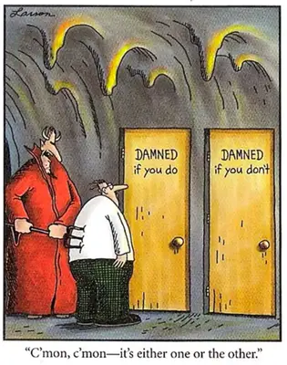 De strip van Gary Larson is de laatste manifestatie van de situatie zonder overwinning. Mijn man Verwijder de zijkant Van de De druk van beide deuren wordt gemaakt. Deze persoon is gemarkeerd Als je het doet, zul je verdomd zijn Lezen Als je het doet, zul je verdomd zijnn’t. è is de perfecte omgeving voor domheid en weerspiegelt dat u moet kiezen uit twee enge opties. Dit model is met name geschikt voor moderne ontevredenheid in de sociale, politieke of economische context, die verlies verliest.