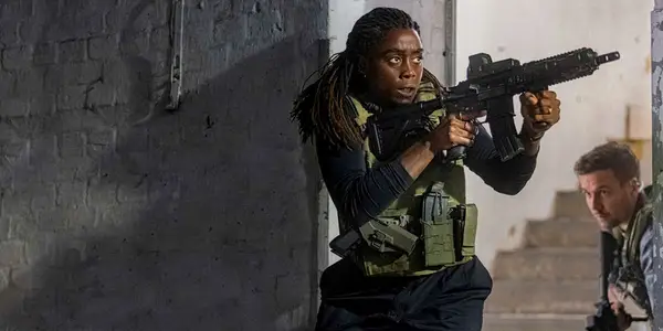 Bianca (Lashana Lynch) richt een aanvalsgeweer op de dag van de Jackal Afbeelding via Peacock | Lashana Lynch | Bianca Pullman vlekkeloos einde |