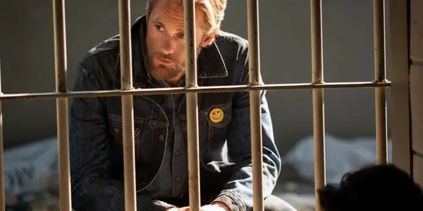 Alexander Skarsgard als Randall Flagg draagt een spijkerjasje met een gele smileygezichtspeld in de tribune.