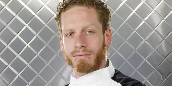 Close -up van Charlie McKay van Hell's Kitchen Season 5 voor een metalen achtergrond