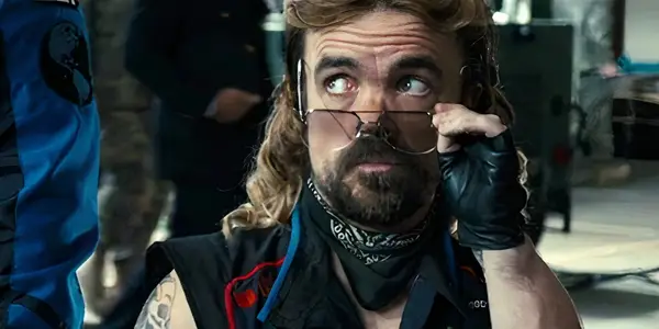 Peter Dinklage die zijn bril aanpassen in Pixels (2015)