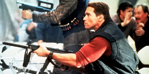 Arnold Schwarzenegger houdt een wapen vast in de lopende man