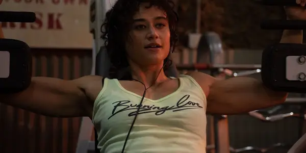 | Katy O'Brian | Een deelnemer | Een nog van liefde ligt bloedend. Jackie (Katy O'Brian) traint op een gewichtenmachine in een vest met een motief van de woorden 'brandende liefde'. |
